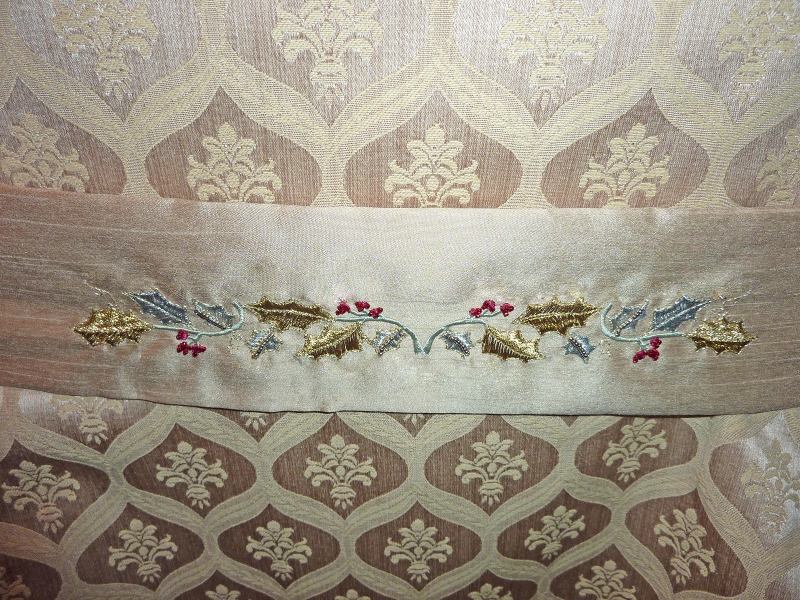 The pleated back waistband segment is reversible, with the reverse side featuring a custom embroidery design with a mirror image layout. The leaves and holly berries are stitched in several thread colors, including metallics.